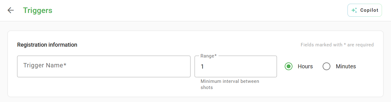 On the screen that opens, first you must enter the trigger name and the minimum interval between triggerings (in hours or minutes):
