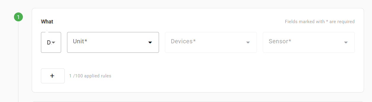 Below, you will define which sensor is used for this trigger (What). To do this, choose the unit it belongs to, the device you want, and the desired sensor.