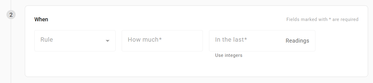 Subsequently, it's time to configure the conditions to activate the trigger (When). To do this, select a rule (condition), the value, and the number of last readings. It is possible to configure up to 10 rules for each trigger.