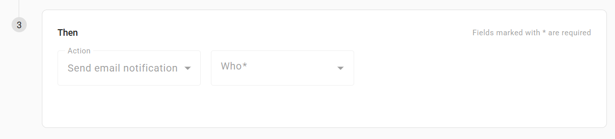 The third step consists of configuring the action to be performed if the trigger condition is met (Then) and the person responsible for the action (users or user types):