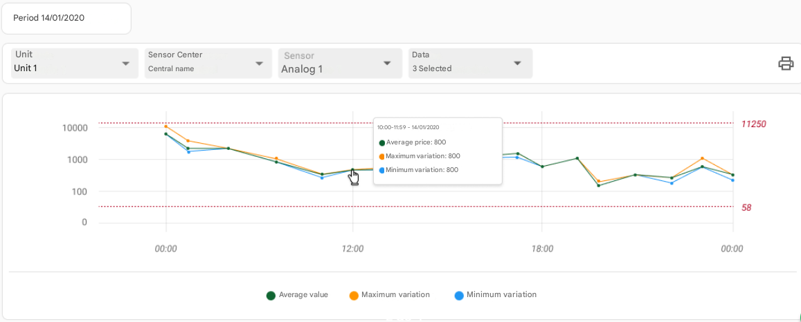 It is possible to select the Accuracy Level (in time), Unit, Devices, Sensor and the desired Data Type. By default, we will select the Unit and the Device according to the previously selected item. In addition, it is possible to configure the desired period.