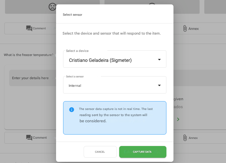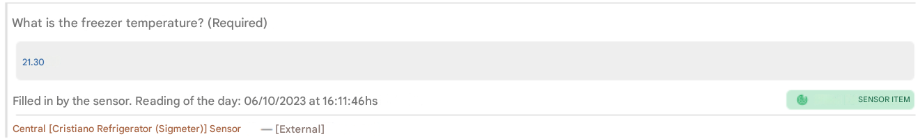 After selecting the device, the sensor, and capturing the data, the item will be answered with the last reading received. On the screen and in the report, it will appear which sensor was used in the response and the date and time of the last reading.