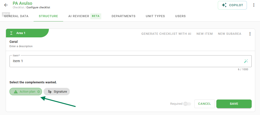 After configuring the structure, link the action plan to the desired departments, unit types, and users. Finally, click Save.