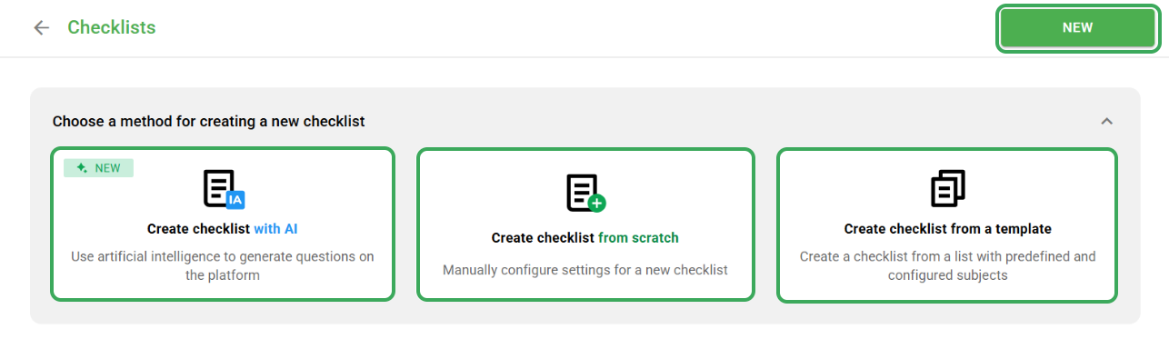 Step 2: There are 4 ways you can create a checklist, the options being: (1) New, (2) Create checklist with AI, (3) Create checklist from scratch or (4) Create checklist from a template.