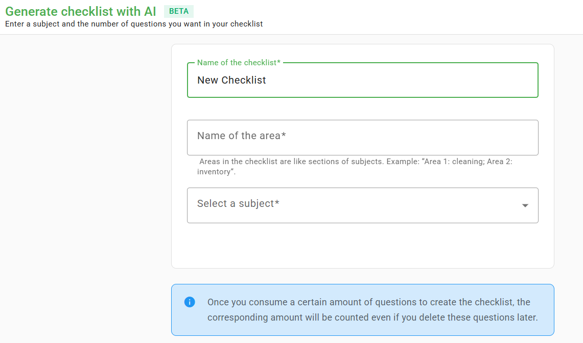 - (2) Create checklist with AI: this option allows you to use artificial intelligence (AI) to generate questions for your checklist, optimizing time. Just give it a name, type the name of the area, select a subject of interest, the number of questions you want (maximum 250) and that's it: your checklist will be generated automatically!