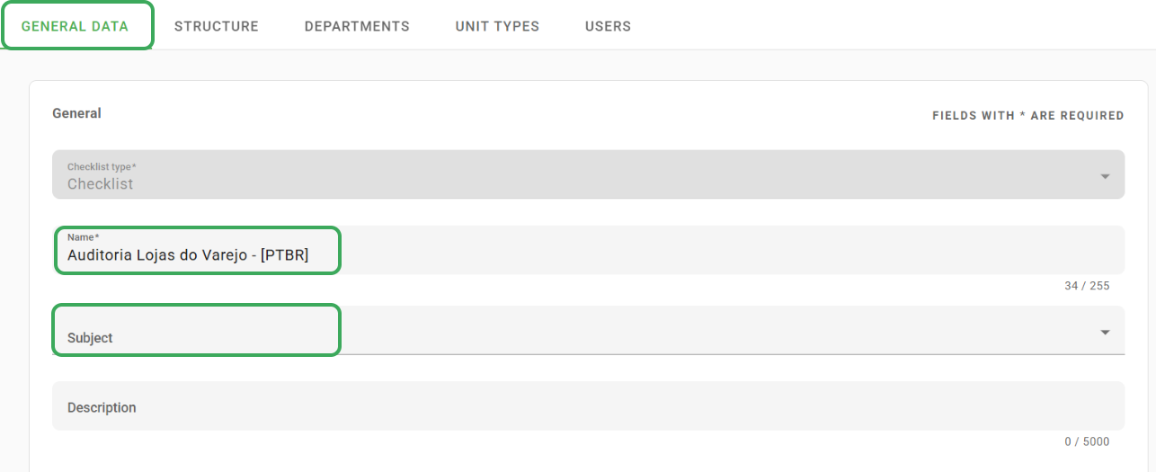 If you choose to create a checklist from scratch, the first step is to fill in the Registration Data, available on the first tab of the checklists screen.