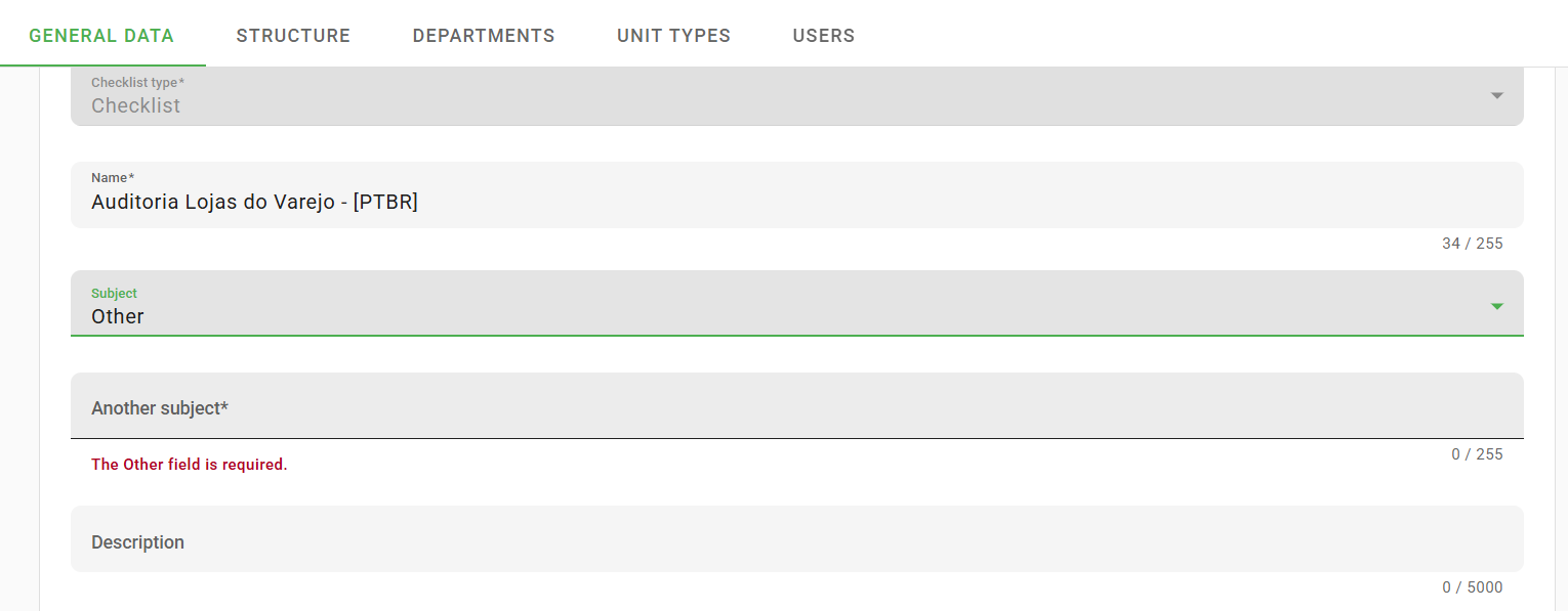 Here you will name your checklist, select a Subject from the drop-down list or click on "Other Subject" and enter a theme corresponding to the checklist being created. These two fields are mandatory and help to facilitate the identification of these checklists later, as is the case with the subject field, which can be used as a filter when searching for a specific application.