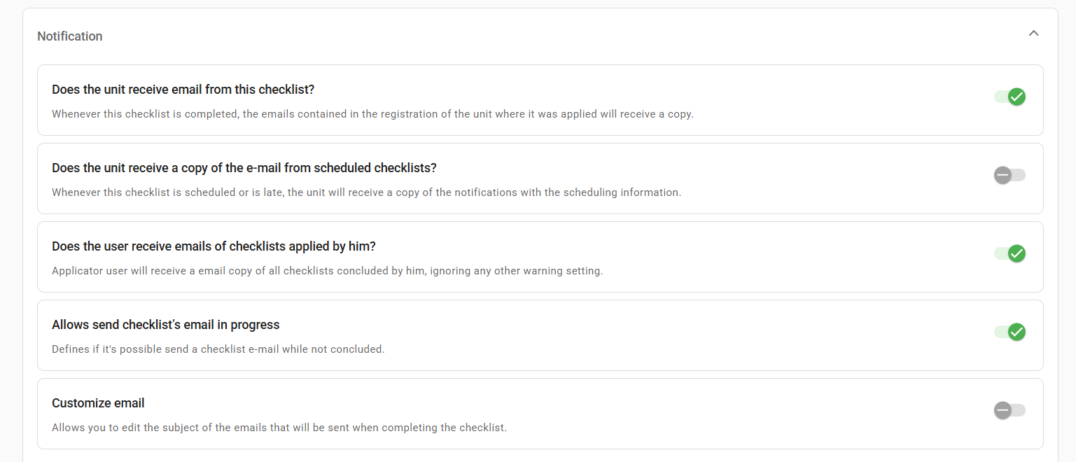 ➕ Tip: Still on the Registration Data tab, you can configure notifications, enabling the checkboxes and allowing your units and users linked to this checklist to be notified, by email, when the application generates a notification.