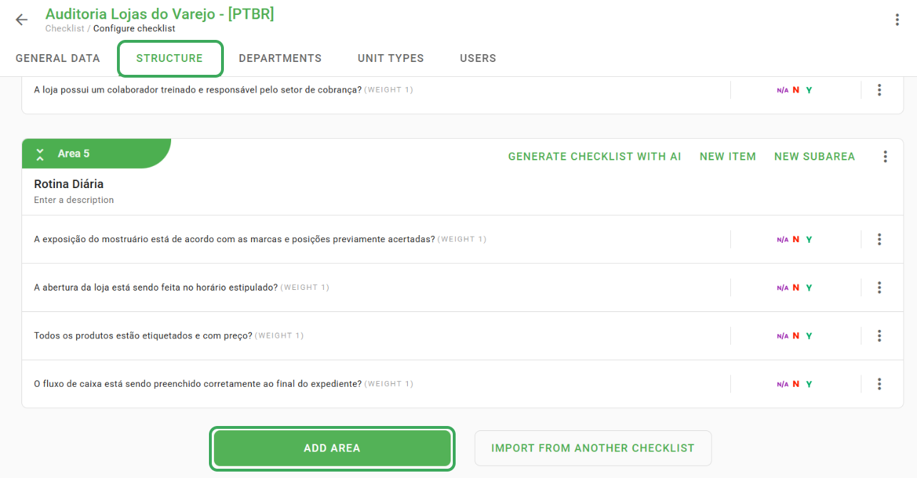 The next tab is Structure, where you will add questions and add-ons to your checklist. In general, this is the part that will be evaluated by the user applying the checklist.