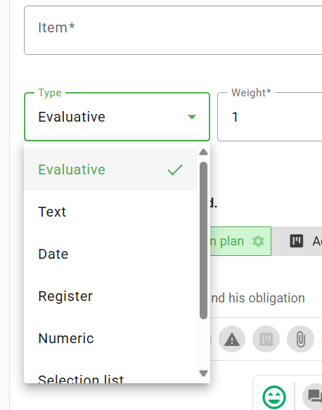 In the evaluation type, you can also choose the weight that this item will have in the final evaluation of the checklist: