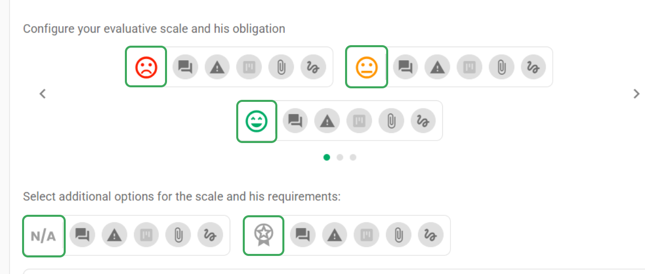 See what each type means: - Evaluative Type: this is the most common type, with three response options available: Yes or No, evaluative faces or an additional response scale, with the possibilities of N/A (not applicable) and Medal (exceeded).