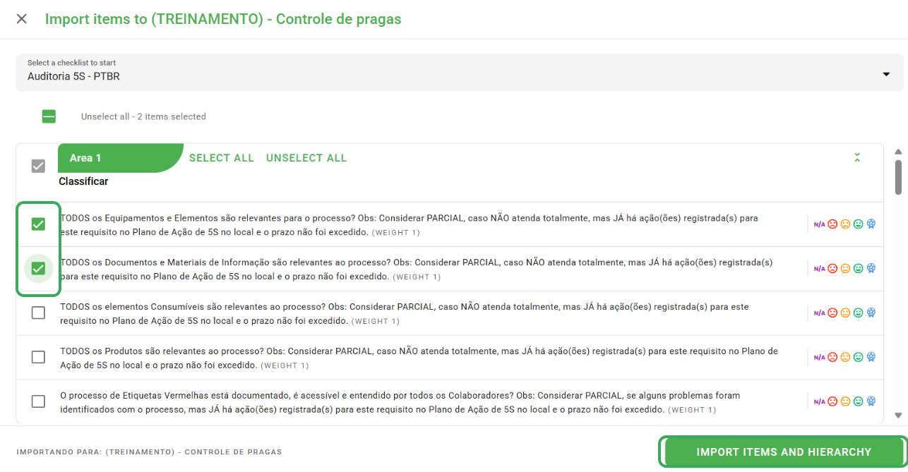 Select the checklist, and then select the items you want to import into your new checklist. It is important to note that this import will occur while maintaining the hierarchy of the items. Finally, click the "Import items and hierarchy" button.