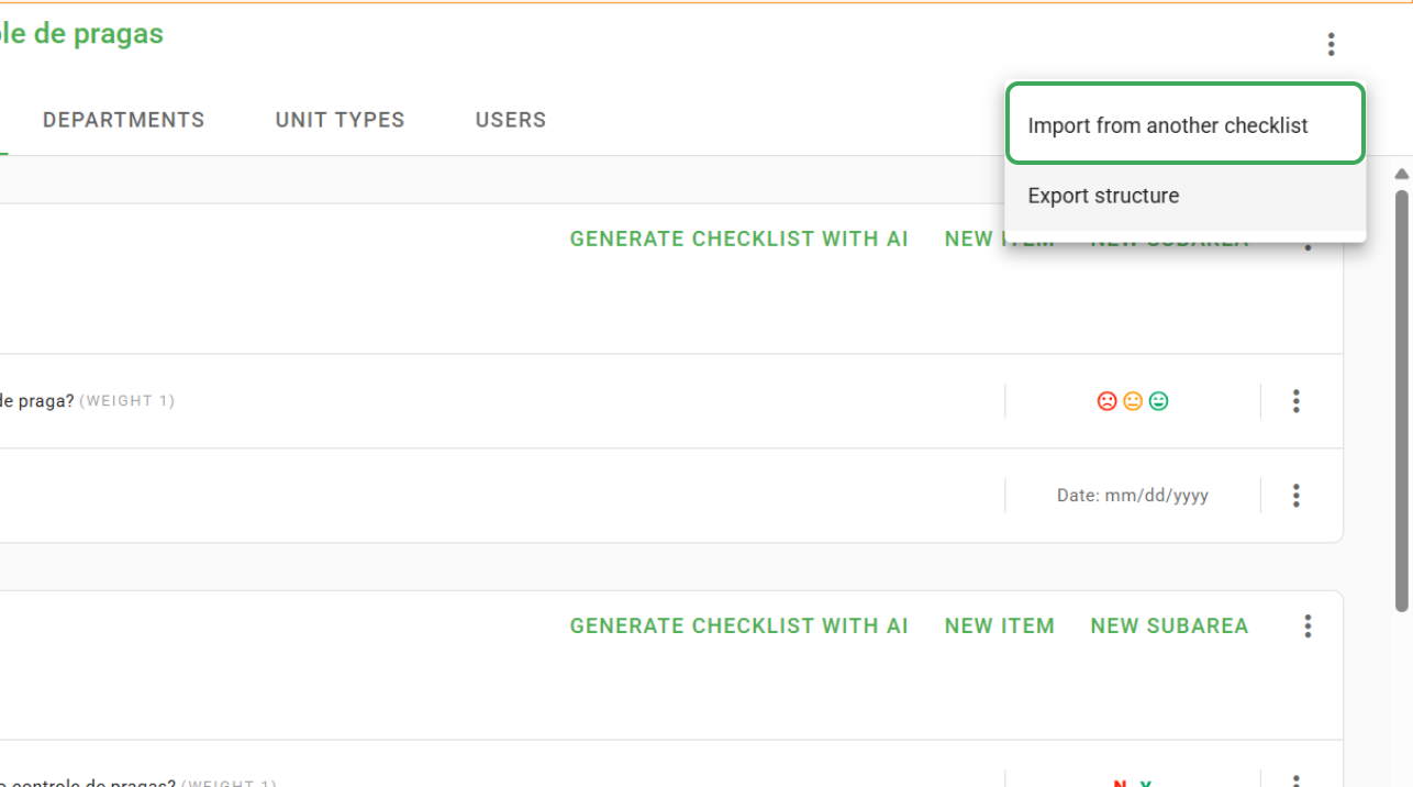 - Import via spreadsheet: when creating a new application, in the Structure tab, you can import a checklist via spreadsheet directly into the Checklist Fácil system. To use this option, click on the three dots icon in and select "Import via spreadsheet" or click on the "Import items via spreadsheet" button.