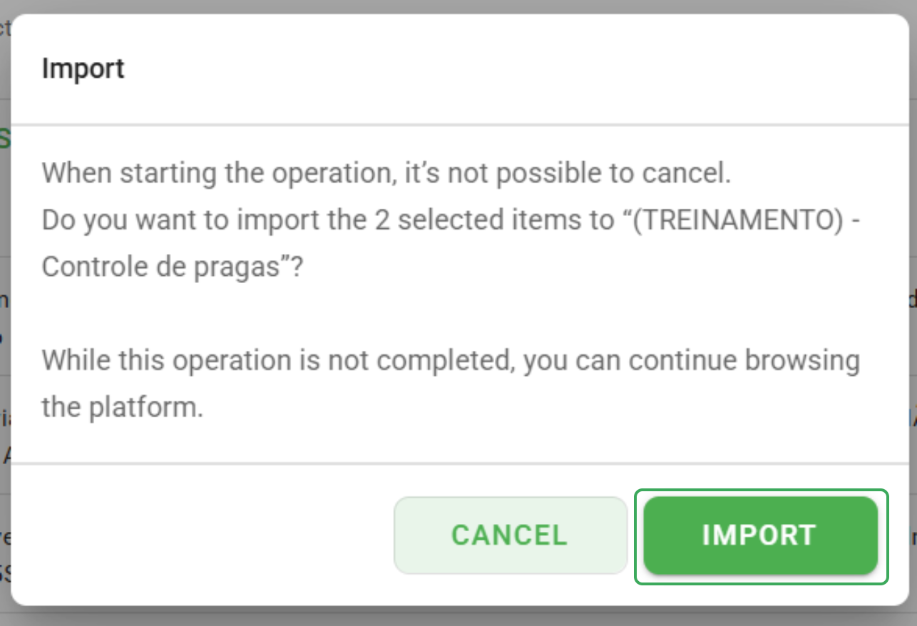 You will be notified that once the transaction has started, it will not be possible to cancel it, but until it is completed you will be able to continue browsing the platform. To continue, click on "Import".