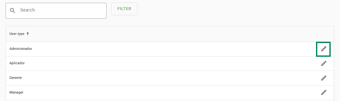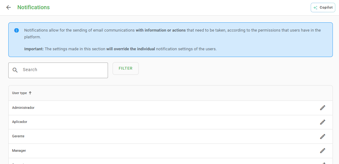 Step 1: By clicking on Notifications, you will view all user types previously registered in your account, allowing you to change notifications in bulk.