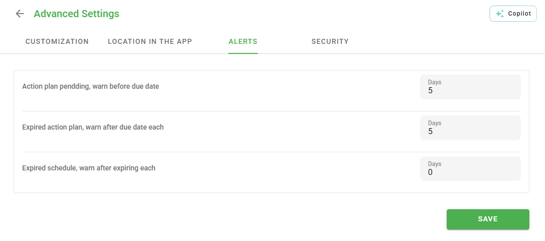 - Pending action plan, notify before due date: Configure a time interval to alert those responsible for pending action plans before the deadline.