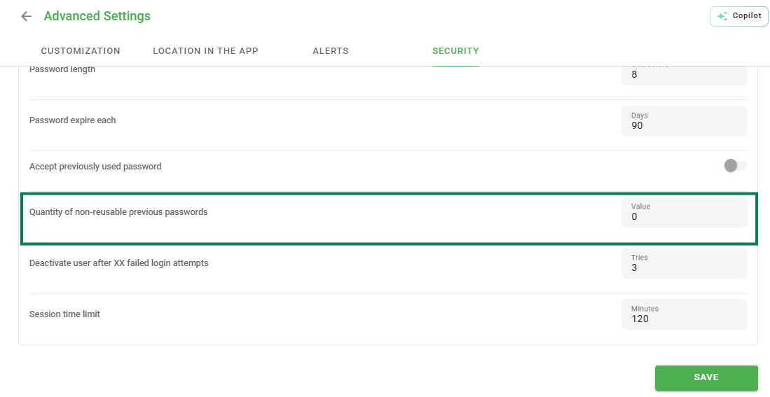 Number of previous non-reusable passwords: In this option, you define how many previously used passwords will not be accepted for use in the system.