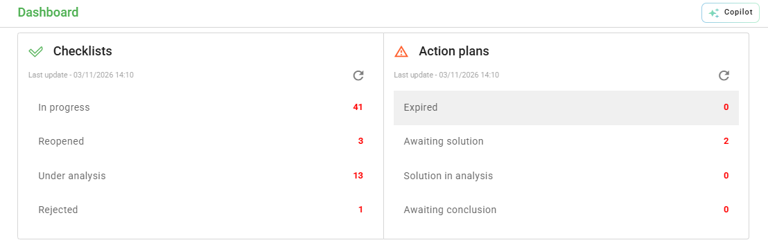 2. Action Plans: In this dashboard, you can view some of the statuses of Action Plans that have not yet been Concluded and are Overdue, Waiting for Solution, with Solution Under Review, and Waiting conclusion. Similarly, by clicking on them, you will be redirected to the "Action Plans" tab.