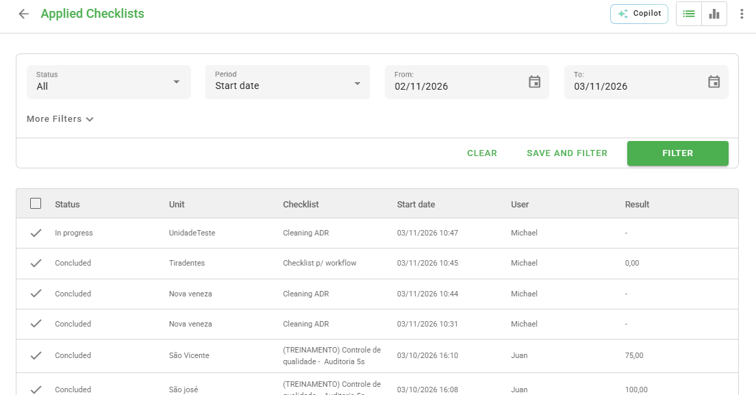 ? Tip: Use the filters at the top of the screen to check the status and application period of your checklists.