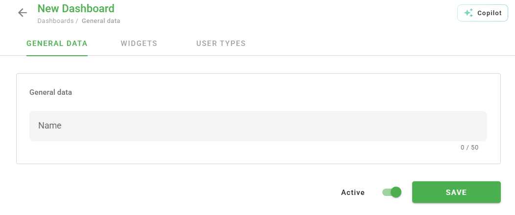 Step 3: In the Registration Data tab, enter a descriptive name for your new dashboard, leave it active, and click Save.