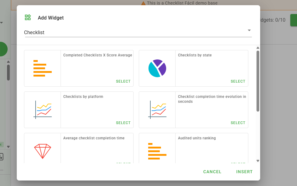 ⚠️ Attention: Each dashboard can contain up to 10 widgets. Once you select one of interest, click Insert.