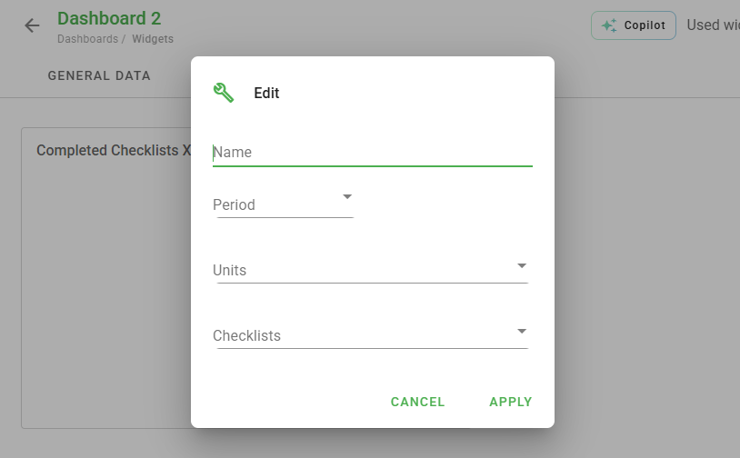 Personalize the chart name, define the viewing period (e.g., last 7 days), and select the desired units and checklists. Click Apply.