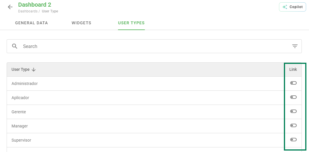 In the User Types tab, you will select who will have access to this dashboard. It is possible to specify different panels for different profiles.