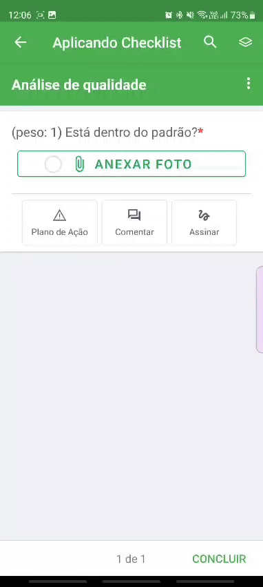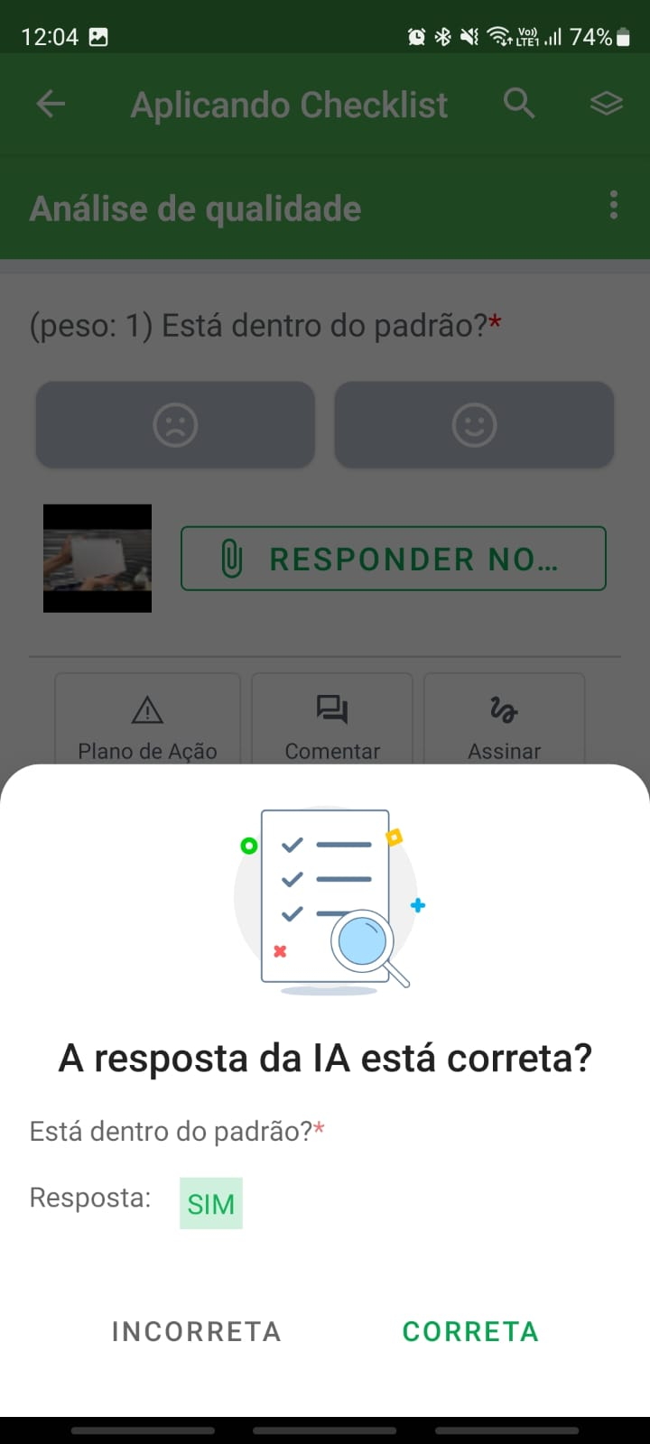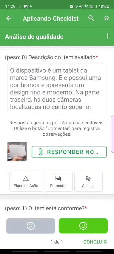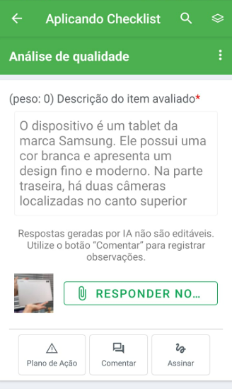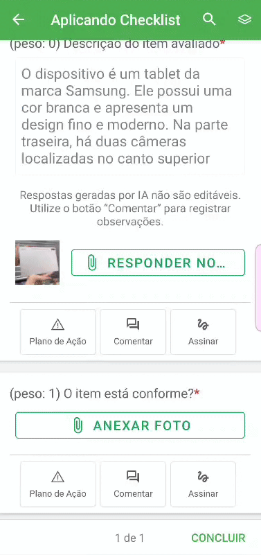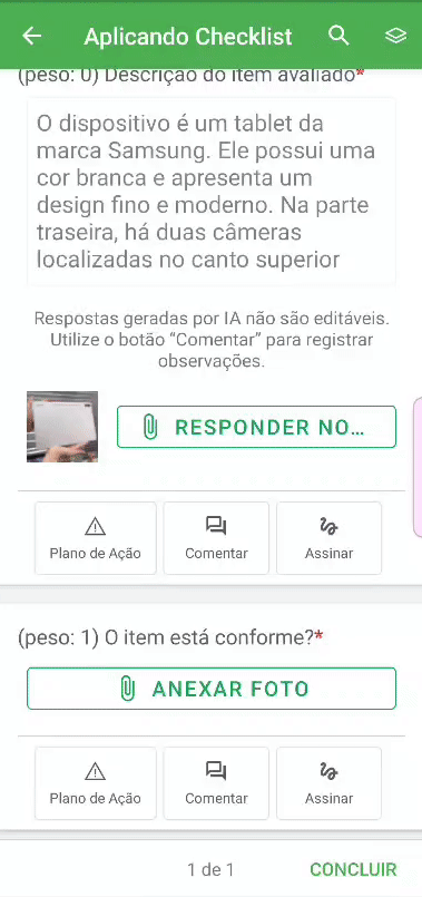 For text-type items, the process is the same. When attaching the image, the Artificial Intelligence will perform the analysis and fill in the field with a descriptive text response.