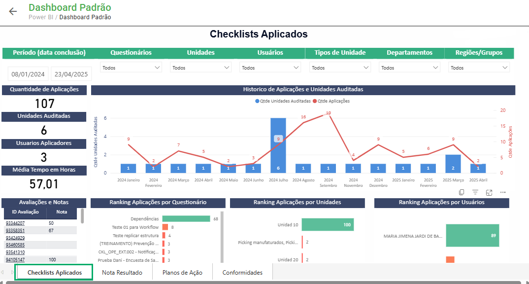 In the Applied Checklists tab, you can view everything related to the subject, such as units where it was applied, users, and the number of applications, in addition to being able to add filters to segment the search.