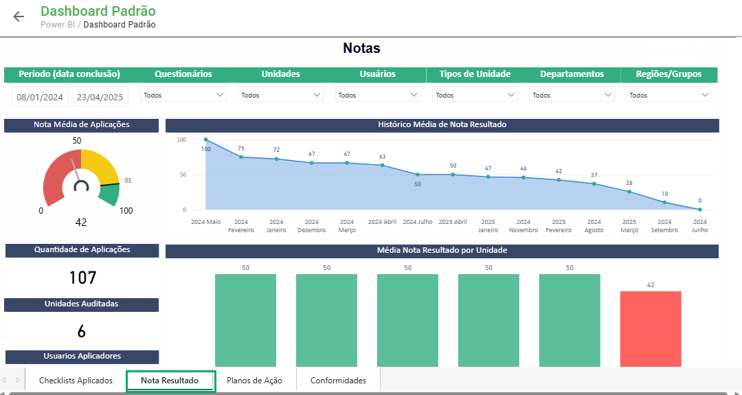 In the Result Grade tab, it is possible to obtain information about checklist grades, such as detailed monitoring of grade averages by each unit, applications, users, departments, among others.
