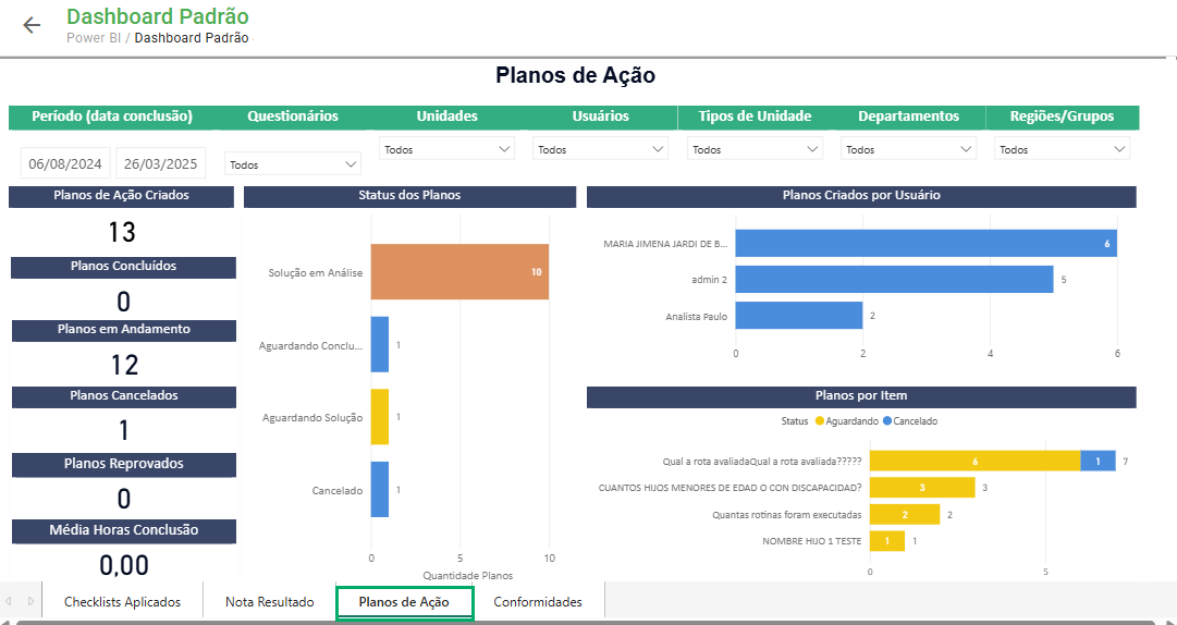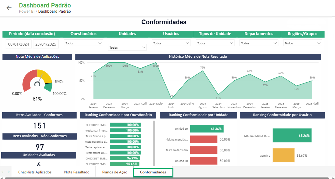 In the Compliances tab, it is possible to obtain information about compliances and nonconformities found during checklist applications and their relationship by units and users, for example.
