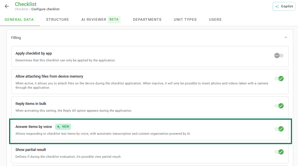 The Answering items by voice feature was developed to facilitate daily operations, allowing users to answer checklist text fields using the audio resource. Through automatic transcription via Artificial Intelligence, we aim to reduce operational effort and significantly increase the speed of filling out forms in the field.