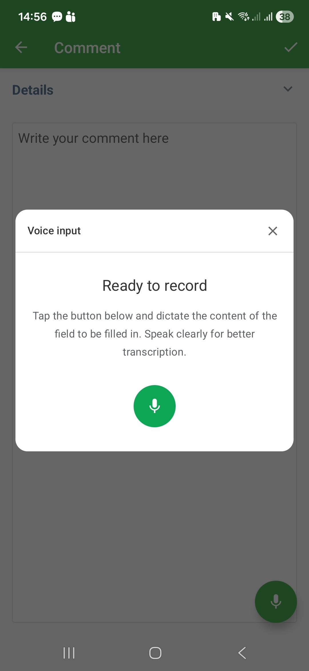 When opening a configured checklist, you will see a microphone icon on the right side of eligible fields. The workflow is simple: