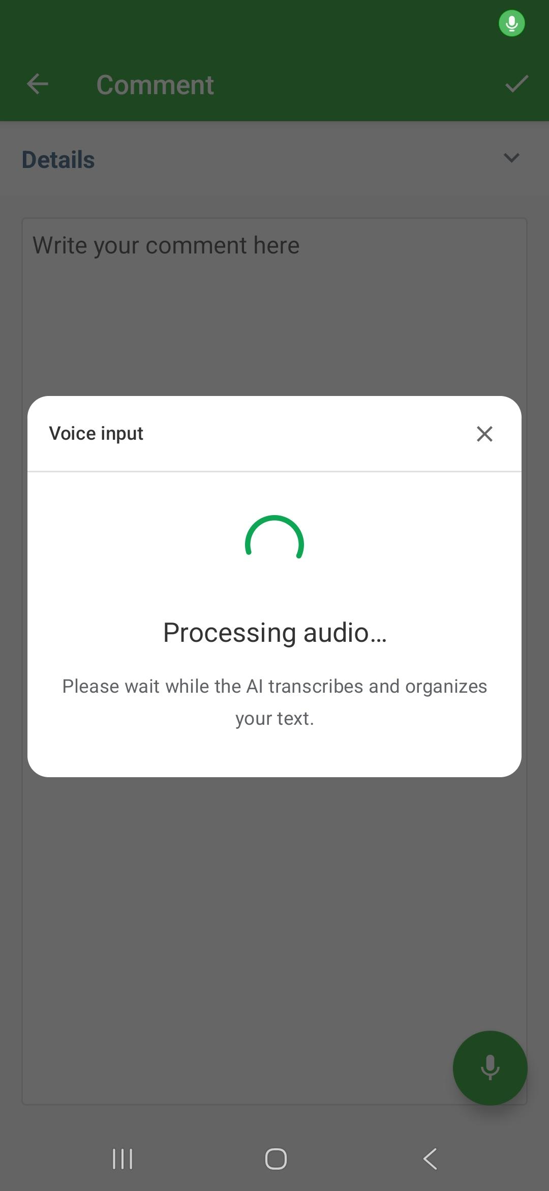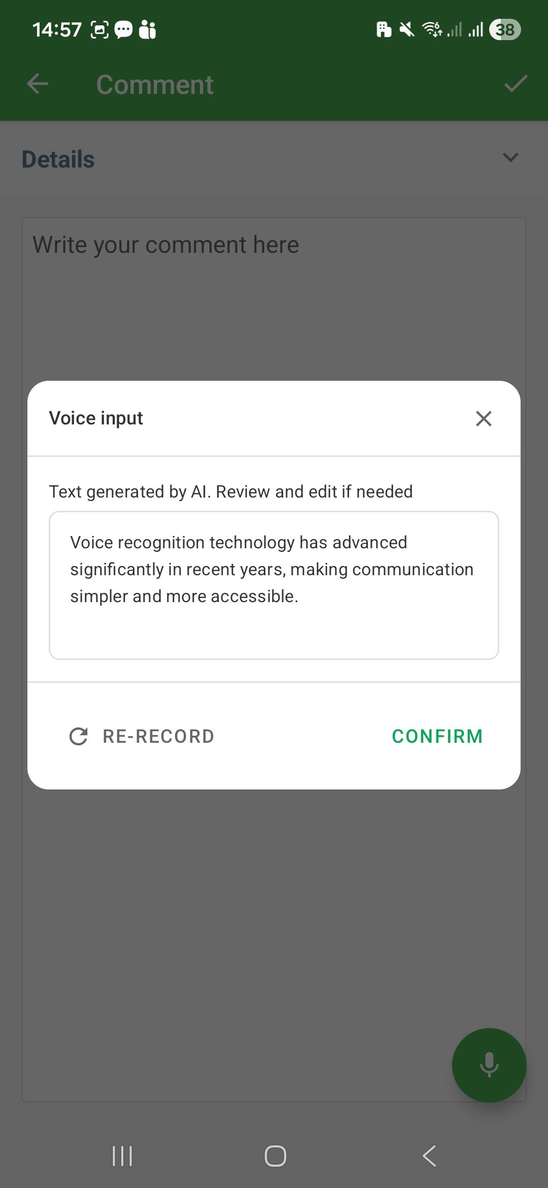 4. Review and confirm: The text will appear on the screen for review. You can edit manually or confirm so that it is inserted into the field.