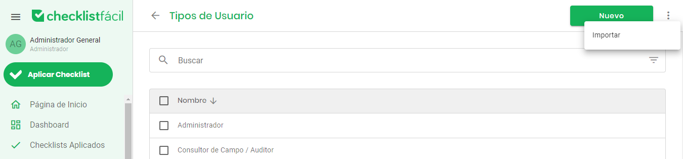 Accediendo a la pantalla de configuración de tipos de usuario, haga clic en los tres puntos al lado del botón nuevo y seleccione la opción importar: