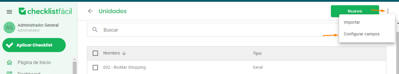 Es posible configurar un nuevo campo de registro para las Unidades. Acceda al menú Configuración > Unidades y, en la parte superior derecha junto al botón nuevo, haga clic en los tres puntos grises para seleccionar Configurar campos.