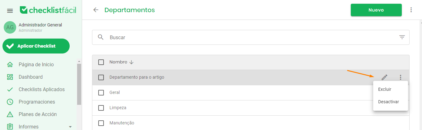 Accediendo al menú Configuraciones > Departamentos, puedes editar, eliminar o desactivar un departamento.