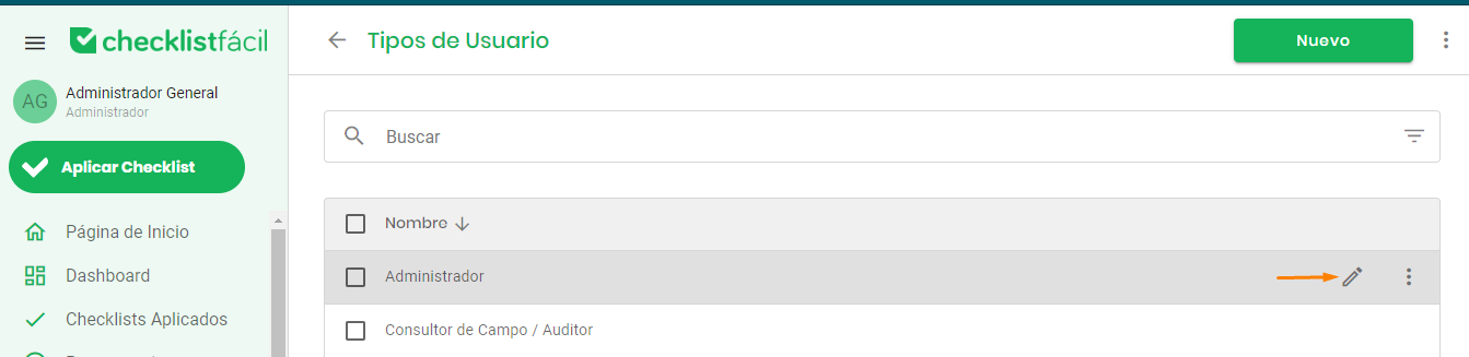 Para editar un tipo de usuario, simplemente ponga el cursor sobre la opción y haga clic en el ícono de lápiz. La pantalla de edición permite cambiar todos los campos definidos originalmente en su registro.