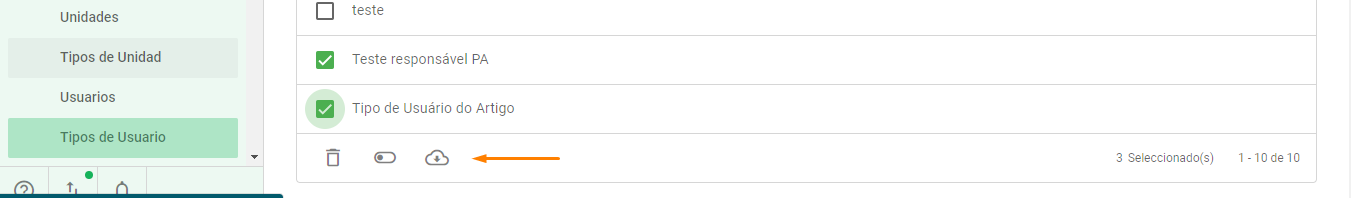 Con un tipo de usuario ya registrado, es posible definir cuáles son sus permisos de acceso. Accediendo a la pantalla de tipos de usuario, es posible, además de editar, realizar acciones masivas como borrar, desactivar y exportar informaciones.