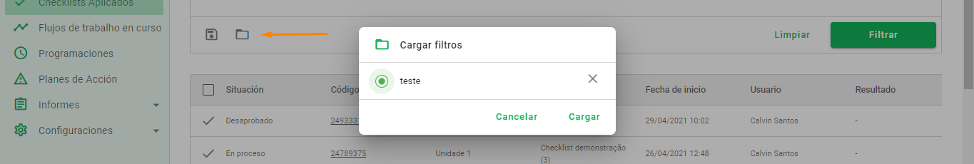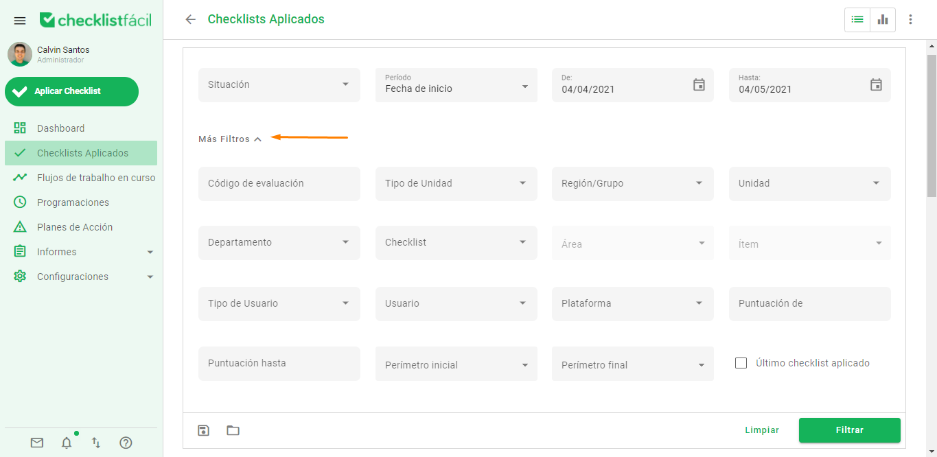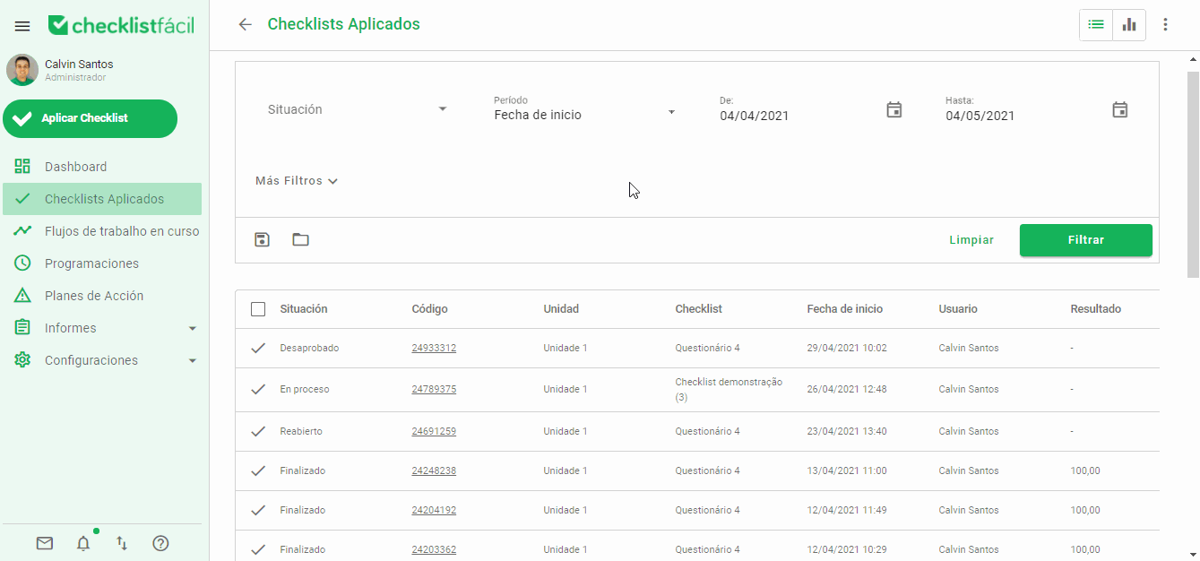 Al hacer clic en la opción Checklists Aplicados en el menú disponible a la izquierda, tendrás acceso a todas las evaluaciones registradas dentro de la plataforma. Al seleccionar la opción de la lista, tendremos la lista de evaluaciones que se ajustan a los filtros aplicados.