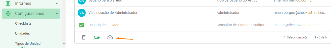 Las acciones masivas están disponibles al seleccionar uno o más usuarios. Se dividen en eliminar (basura), deshabilitar (toggle) y exportar (nube).