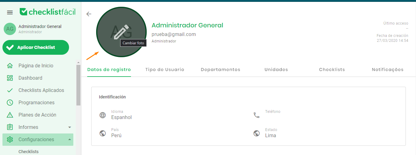 Al hacer clic en el icono de persona (perfil de acceso), tendrás acceso al perfil que recopila todos los datos especificados. Es posible verificar informaciones como el último acceso, la fecha de creación y definir una foto de perfil.
