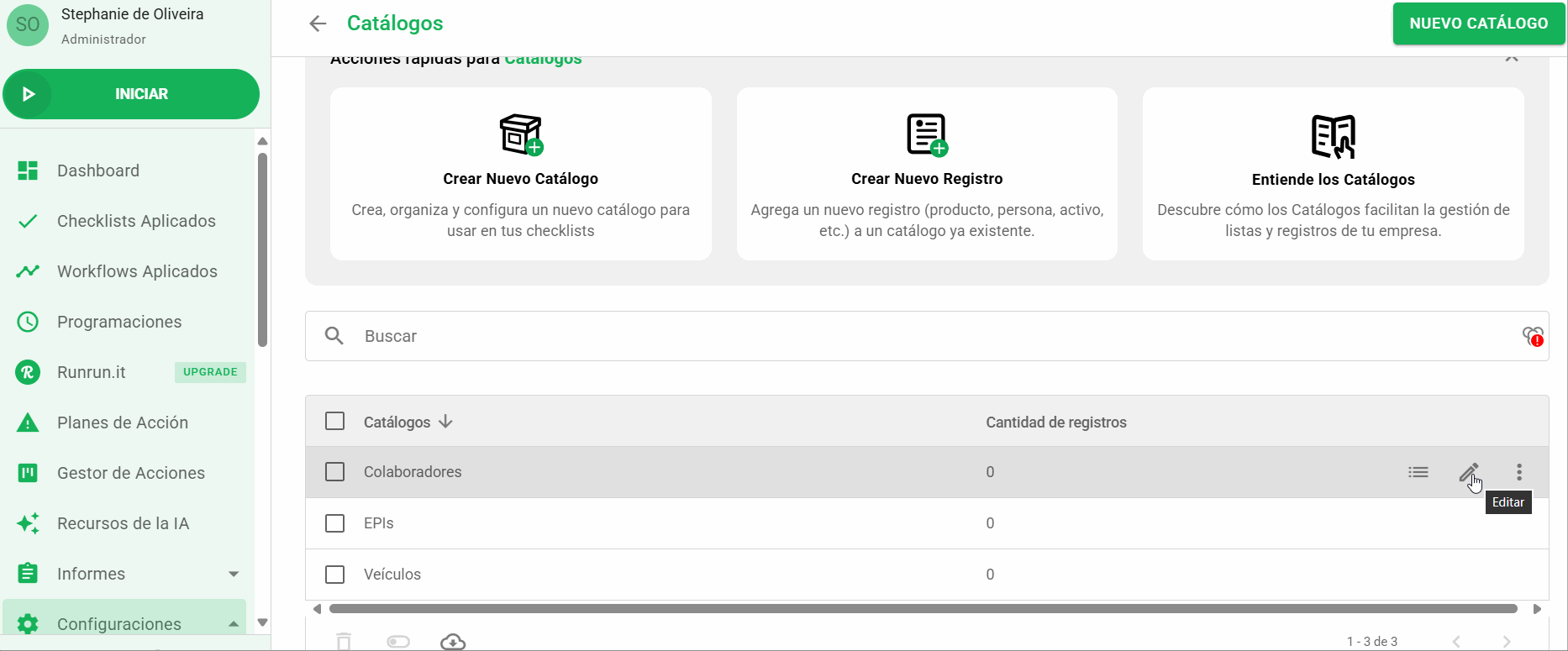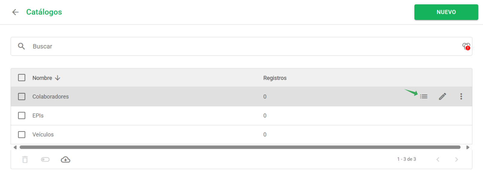 Acceda a Configuración > Catálogos para visualizar su listado de catálogos. Luego, pase el mouse sobre el catálogo en el que desea insertar los registros y haga clic en el primer ícono que aparece en la línea (ícono de lista).