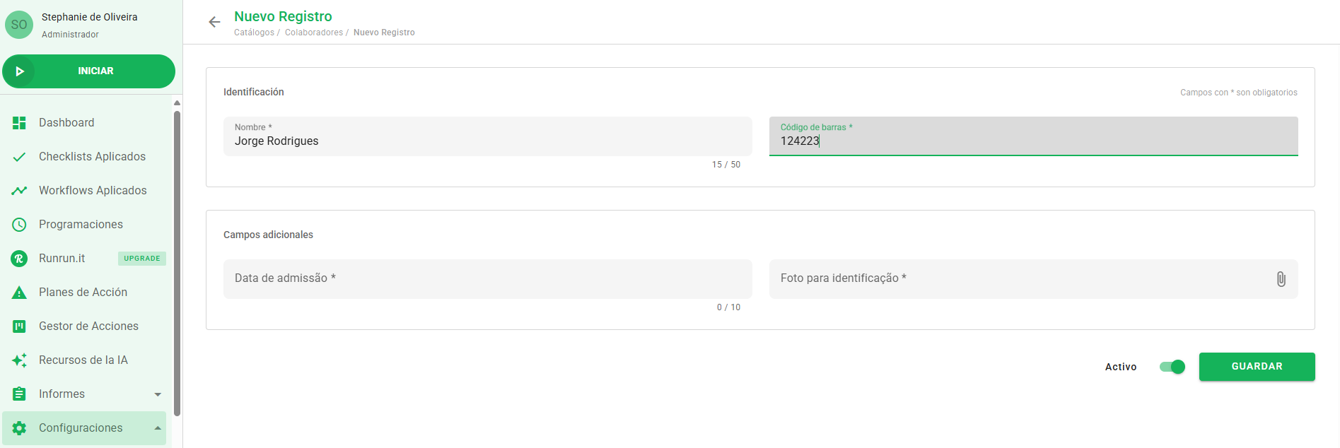 - Código de barras: código único que será utilizado por el sistema para identificar este registro (ej: matrícula, placa, código de producto).