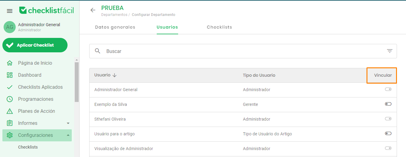 Usuarios, son las personas que tendrán acceso al departamento que se está creando. Para vincular haz clic en el icono toogle para dejarlo verde;