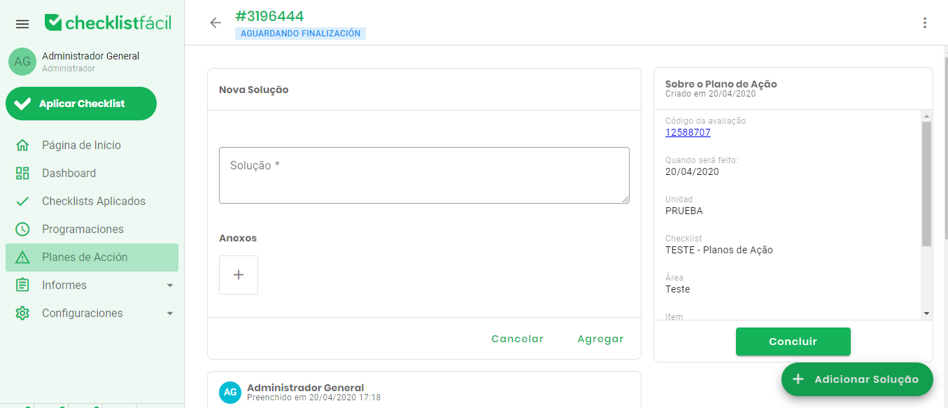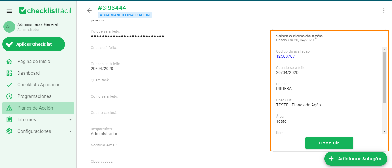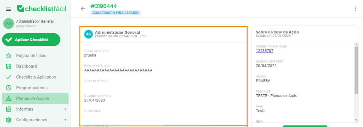 En el bloque derecho, bajo la sección Sobre el Plan de Acción, encontrará los datos del checklist original, incluyendo la unidad, el aplicador y la fecha de la inspección que generó este plan.