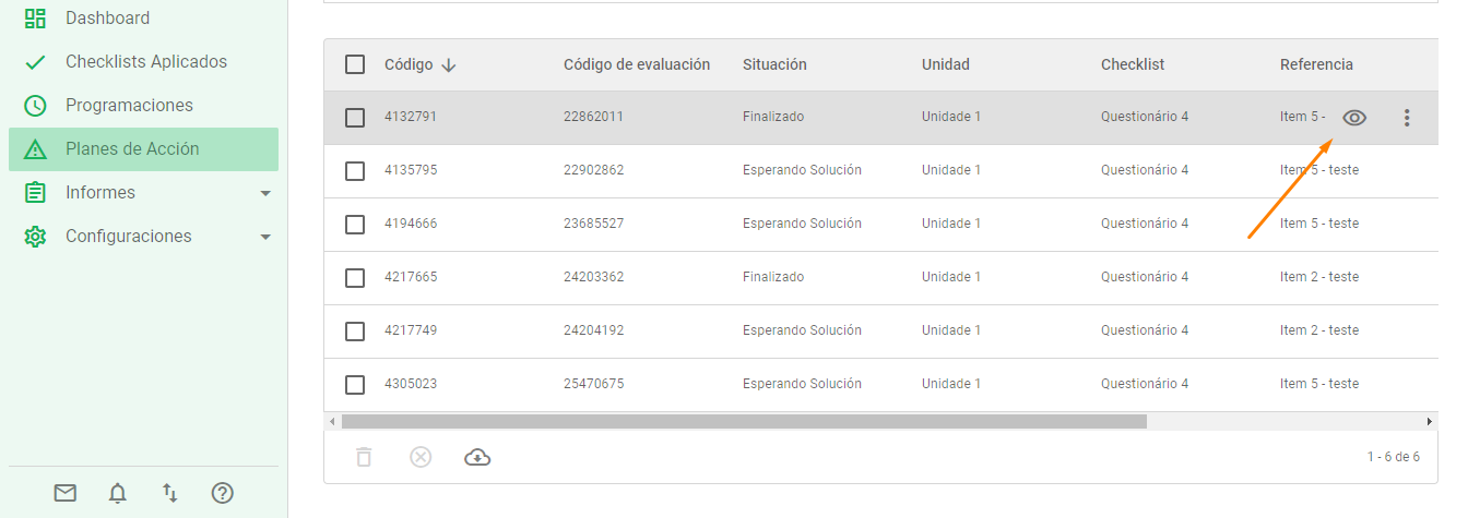 En la página principal de Planes de Acción, al pasar el cursor sobre un registro en la vista de lista, se habilitará el icono del ojo. Haga clic en él para entrar en la vista detallada.