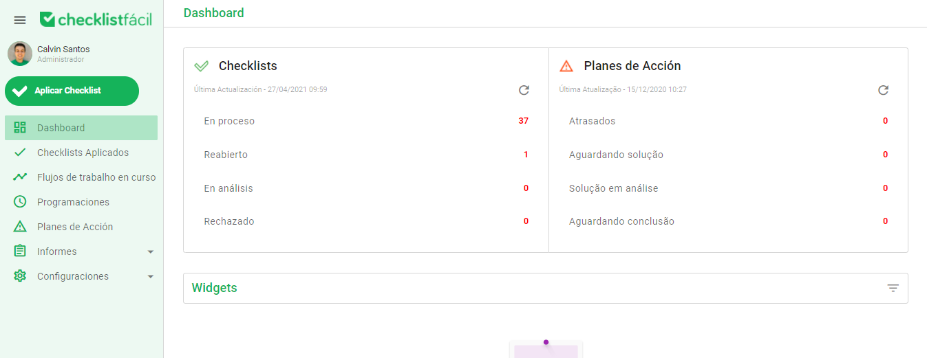 Con la ayuda de Dashboards, puedes obtener una visión general de cómo son los procesos y el progreso de los checklists. En la pantalla de inicio, hay dos bloques fijos disponibles para una gestión inmediata: Checklists y Planes de acción.