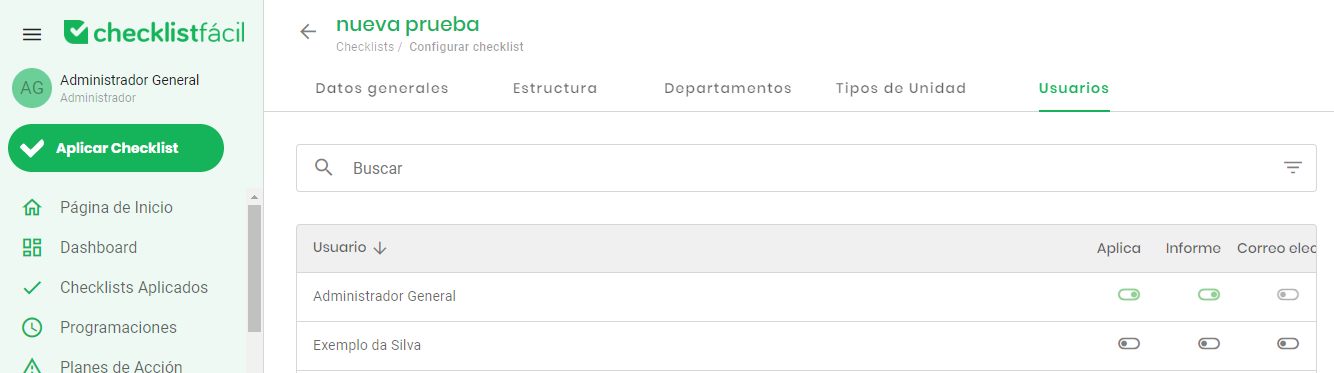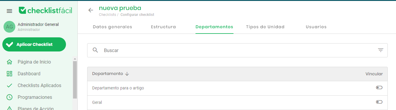 La pestaña de Departamentos enumera las áreas que puedes asociar al cuestionario. Al vincular un departamento, solo los usuarios que pertenezcan a dicha área tendrán visibilidad del checklist.