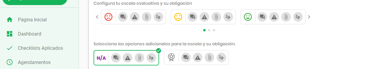 Ofrece opciones cerradas para calificar un ítem. Incluye las variantes de Sí/No y caras evaluativas. Además, permite habilitar escalas adicionales como N/A (No aplica) y Superó.